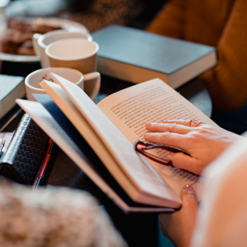 a group of people sitting around the table with books and coffee. Closeup picture of a book with a hand holding reading glasses on the book