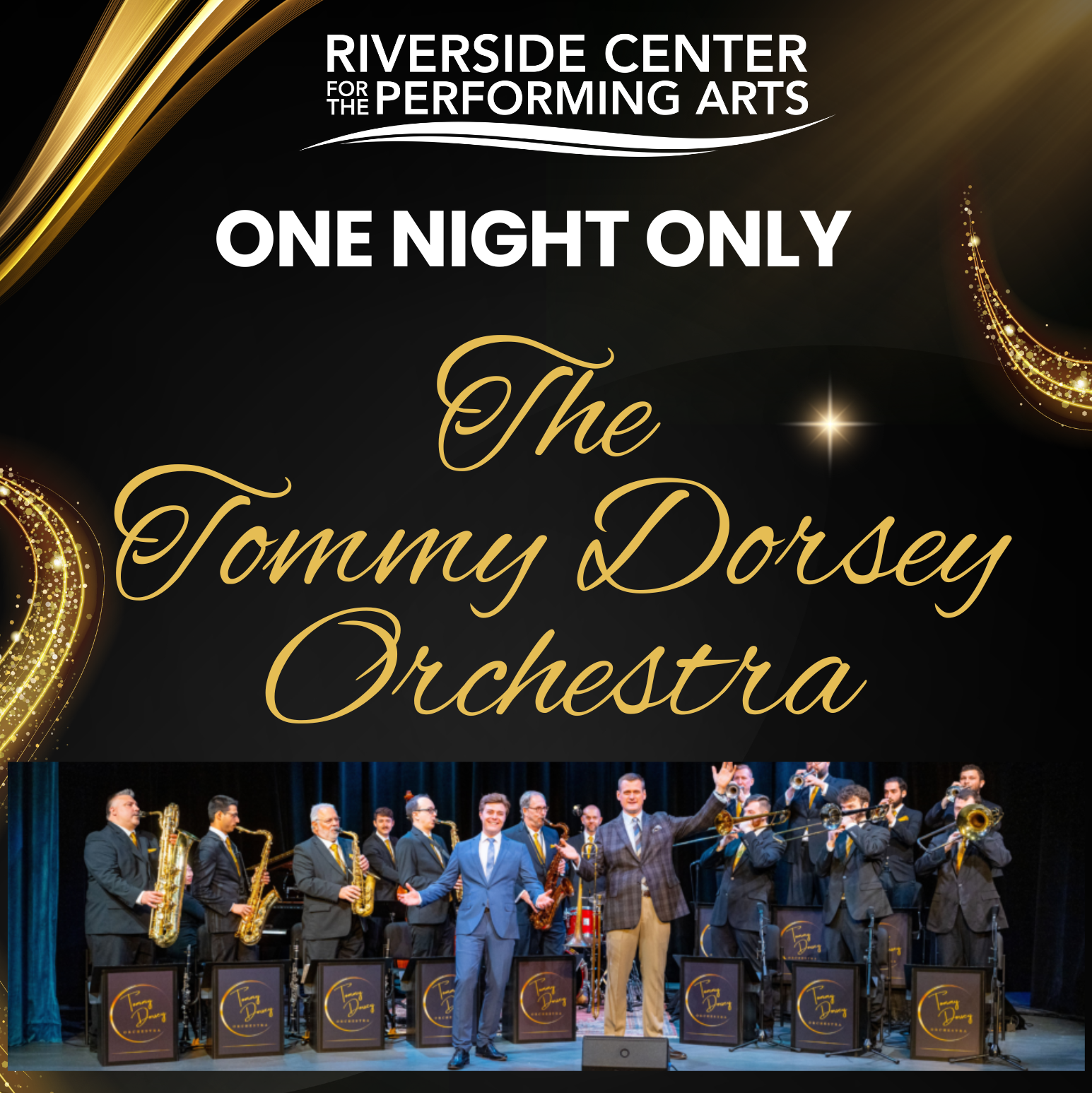 Riverside is THRILLED to welcome the Tommy Dorsey Orchestra to Fredericksburg for ONE night only! In Big Band history, the Tommy Dorsey Orchestra is recognized as one of the best all-around dance bands. Popular almost from the moment it signed with RCA Victor in 1935, it could swing with the best of them. No other band could come close to Tommy’s when it came to playing ballads, especially with the addition of Frank Sinatra as male vocalist. “Opus One”, “Song Of India”, “I’ll Never Smile Again”, “Marie” and “Boogie Woogie” are part of a string of hit records that continue to be performed by The TDO still today. The One and Only Tommy Dorsey Orchestra under the direction of Jeff Bush continues this exciting big-band tradition for audiences worldwide, and fans of all ages.